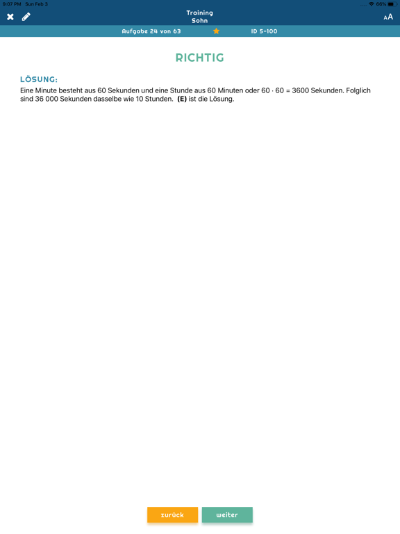 Du hast zwei Spielmöglichkeiten – Training und Prüfung. Zum Üben kannst du ohne Zeitbegrenzung Aufgaben lösen, auch jederzeit das Spiel unterbrechen und später fortsetzen.