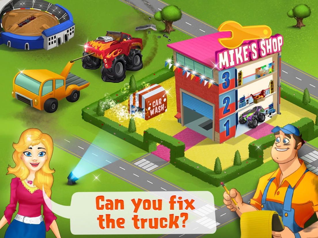 Mechanic Mike is back and more daring than ever! This time he needs your help to fix up monster trucks with brand new tools! Choose from a rocking selection of powerful monster trucks, like the Alien Truck and the Flame Truck! Complete each tune-up floor to earn stars and move on to the next shop level!
