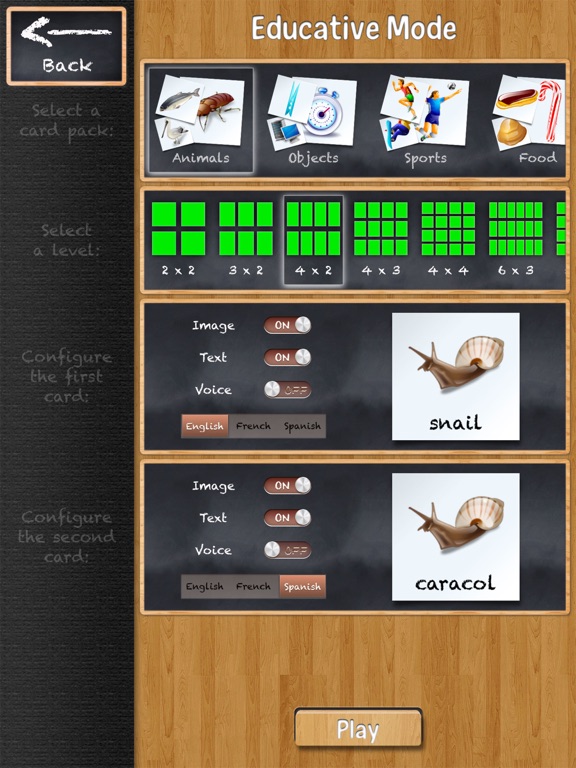 A Two-Player modes is available, and a great Educative mode let you chose the cards images you want to play with, to display or not text below images and to read loud the text with speech synthesis. Moreover, you can learn spanish or french by chosing different languages for first and second card. A really great valuable mode!