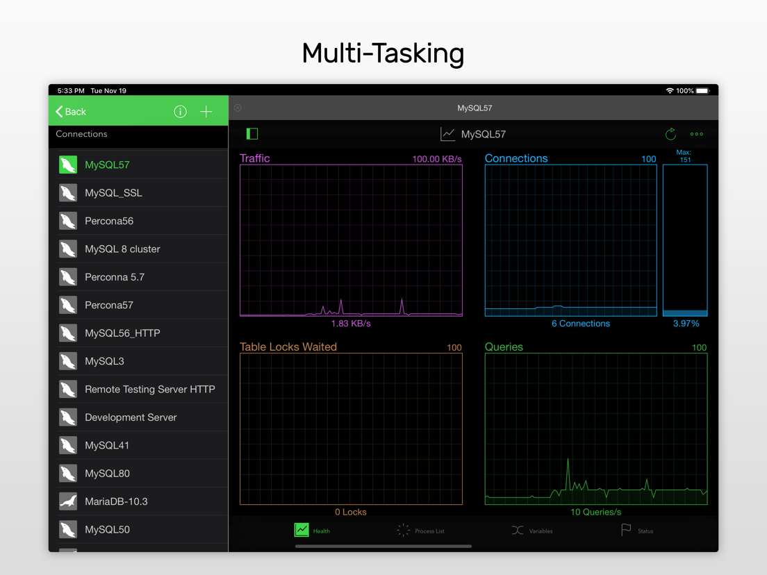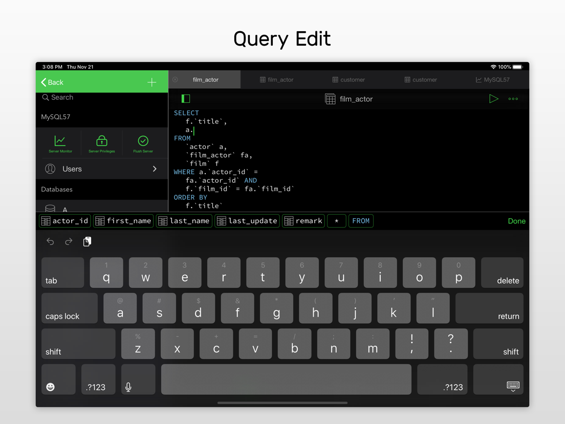 Navicat for MySQL is the first complete database administration tool developed for iOS, giving you the power to manage your databases on the go. Whether you are working from an iPhone or an iPad, Navicat frees you from your workstation.