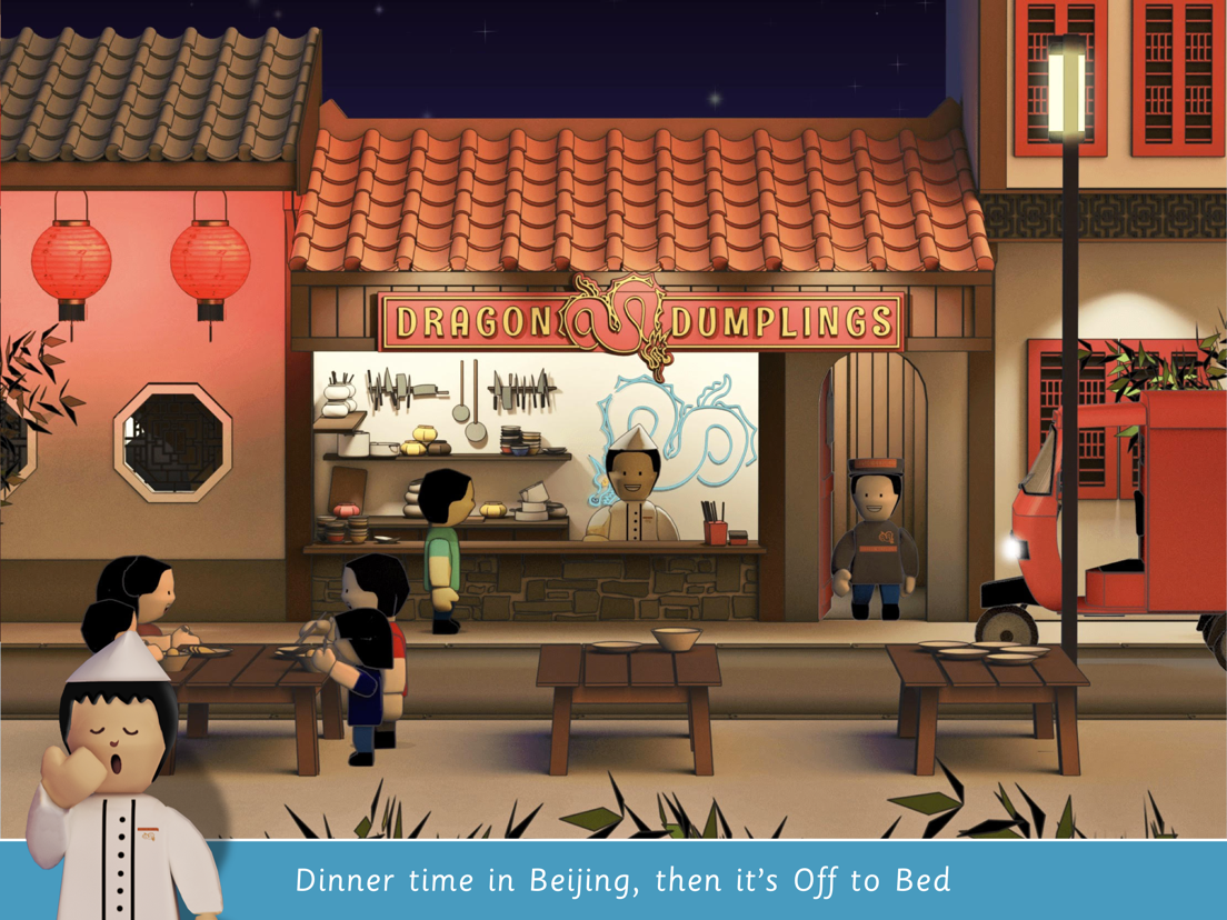 There’s so much to see and do as you make your way around the world, helping others to finish their day and get ready to go Off to Bed. From the elephants in the zoo in London to big red buses or from the Great Wall of China to a favorite noodle and dumpling restaurant in Beijing, each location is filled with detailed animations designed to engage curious young minds.