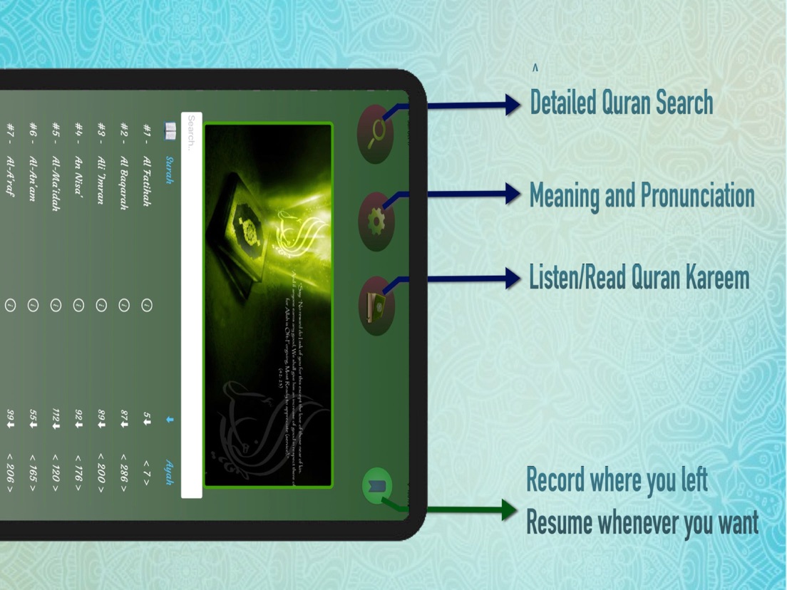 - Following Qur'ân with Pronunciation and Meaning of Ayahs in 30 different languages (English, العربية, Français, Türkçe, Pусский, Español, Deutsch, Bahasa Indonesia, Bahasa Melayu and 22 more...)