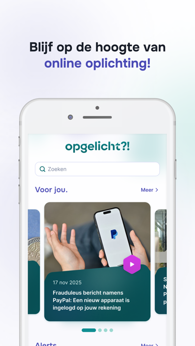 Voorkom dat je slachtoffer wordt van online oplichting, zoals misleidende phishingmails of frauduleuze webshops. De gratis Opgelicht-app is jouw persoonlijke beveiligingsschild tegen cybercriminelen. Volg eenvoudig de onderwerpen die voor jou het meest relevant zijn – of het nu je bank, bezorgdienst of internetprovider betreft. Ontvang direct meldingen over actuele oplichtingspraktijken en blijf online oplichters zo altijd een stap voor.