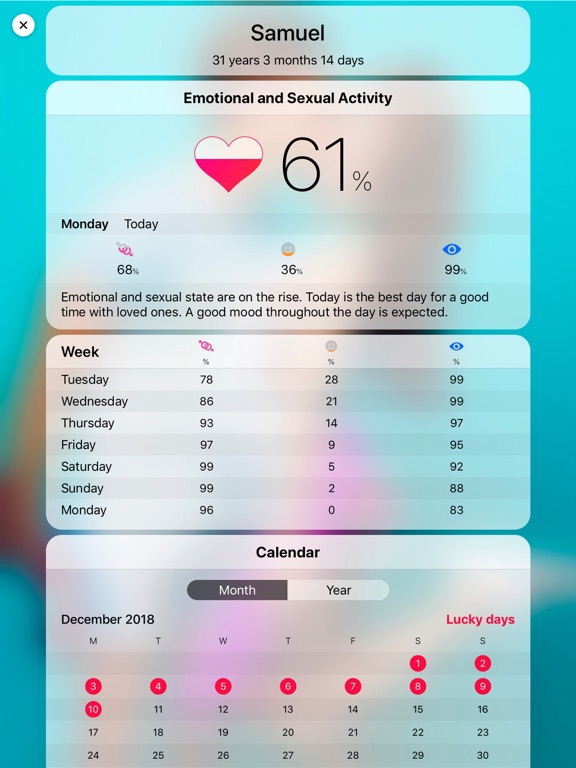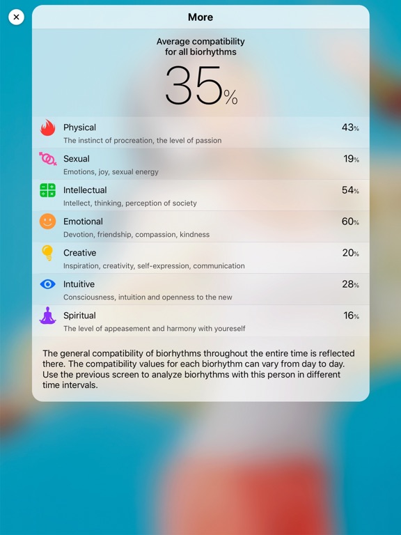 Plan your life effectively with daily charts for your physical, sexual, intellectual, emotional, creative, intuitive, and spiritual activity levels. With Biorhythms, you can also calculate compatibility with anyone — see what you share, where you differ, and plan time together.