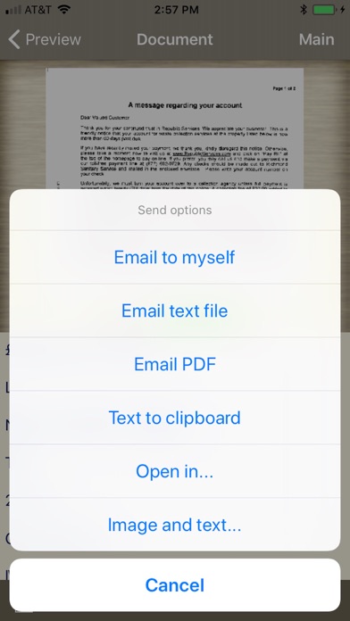 Our unique "Email to myself" feature lets you send documents to a predefined address, or even upload them to an online storage service like Evernote or Box.net, with a single tap. Uploading documents to online services via email is fast, secure, and can be done even if you're temporarily off line. Refer to app help for details.