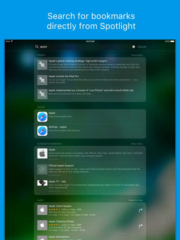 Universal search integration presents Pinner bookmarks alongside web and other app results. Search for a topic and find just the page you wanted, without having to launch Pinner.
