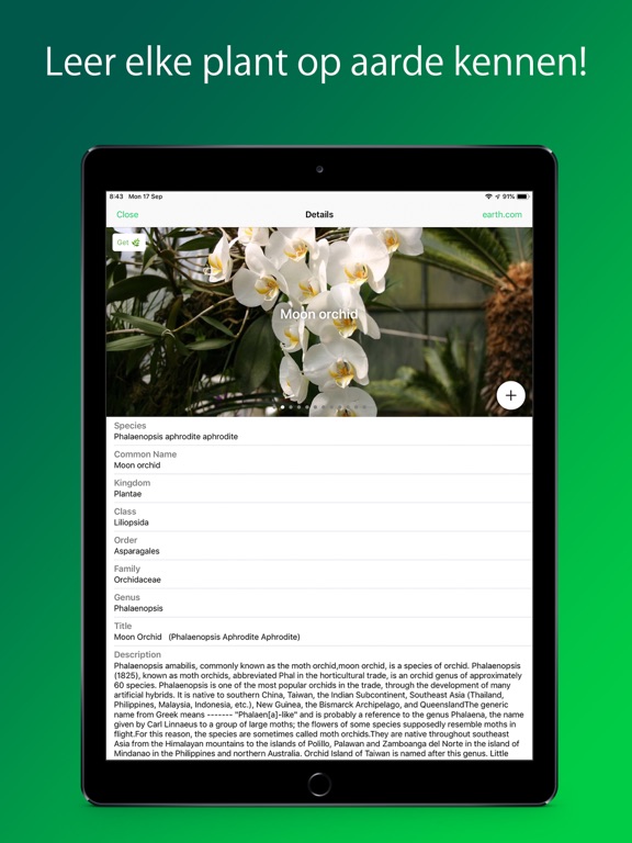Na het identificeren van planten, krijgt u informatie over de taxonomie en een volledige beschrijving van de plant, orchidee, kamerplant, sierplant, exotische bloem en meer. PlantSnap vertelt je ook hoe je planten verzorgt en kweekt.