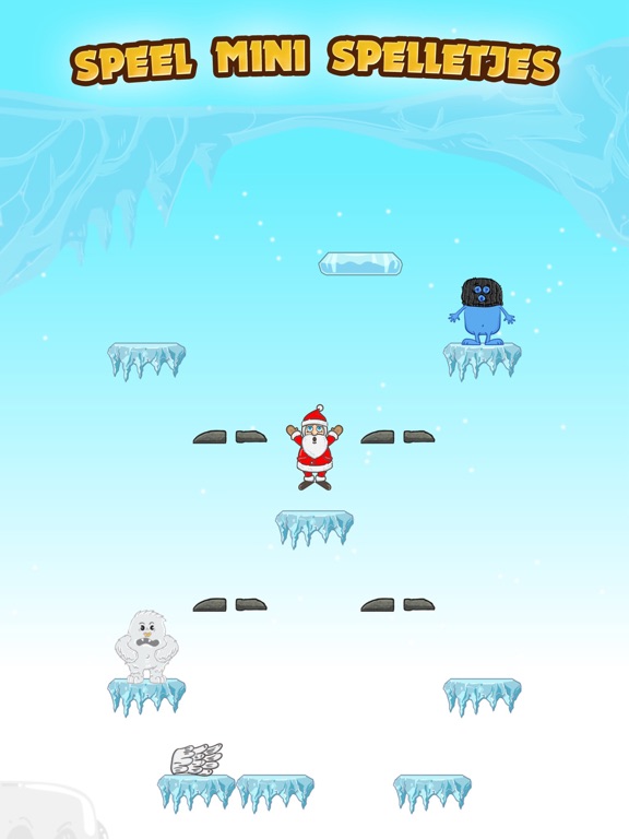 ▸ Speel mini-games met de kerstman. Kies uw favoriet: Vliegende Kerstman, Voedselgrijpspel, Kerstman Springen, Spikes, Kerstman vs. Sneeuwpop