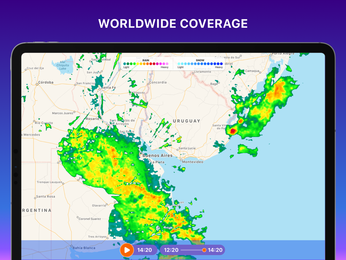 Volg regen, stormen en wind in realtime op een krachtige wereldwijde radarkaart met vloeiende animaties en een volledig vernieuwde ervaring.