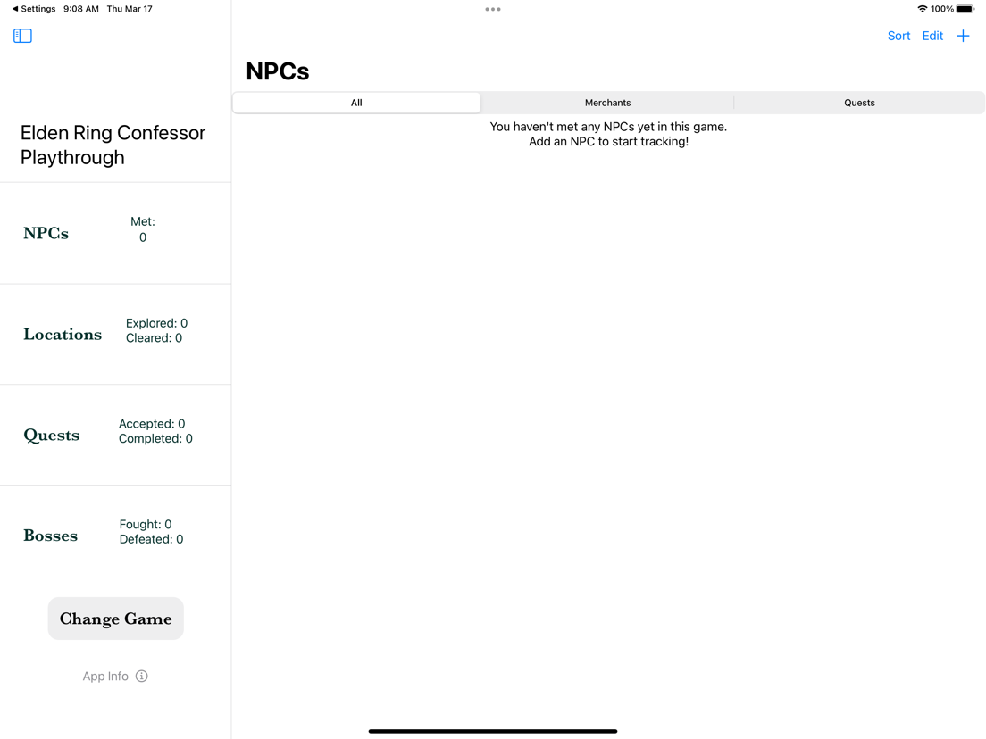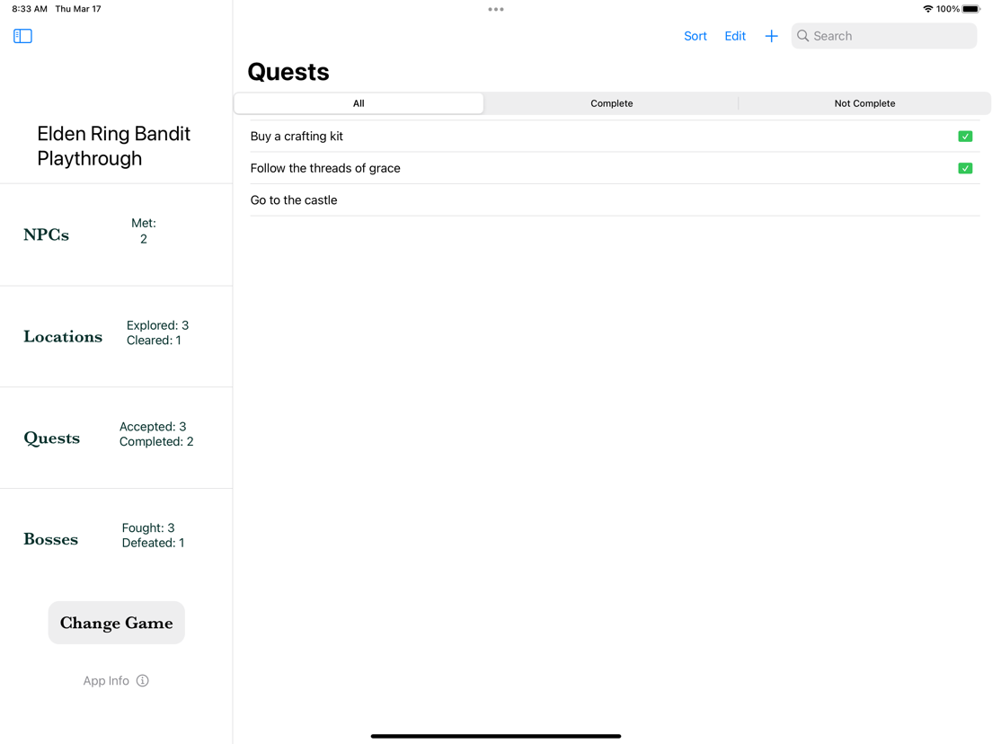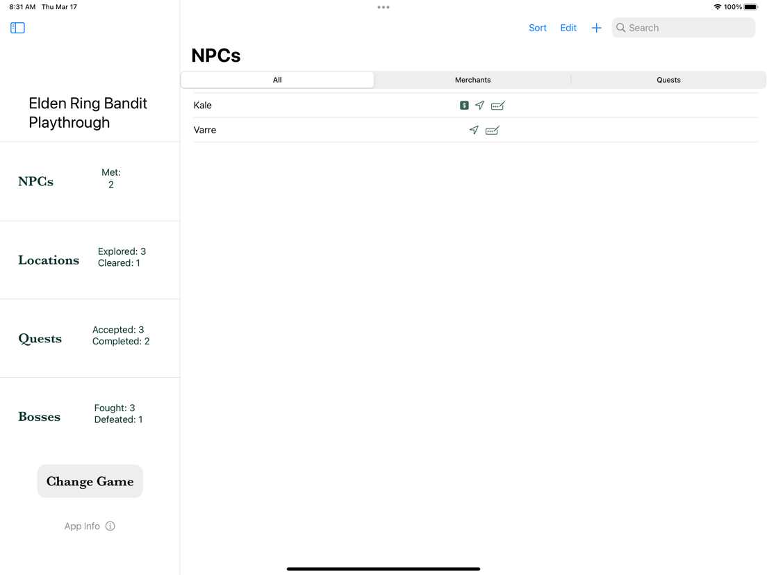 Stop flipping through massive notebooks, or losing your notes entirely, while trying to keep track of your role-playing game progress. Save and easily search for non-player characters, game world locations, quests, and bosses in your favorite RPGs. Track NPC locations and quests, filter on complete or incomplete quests and locations, and view at-a-glance stats for your games. Must-have companion for massive RPG video games like Elden Ring, or your favorite Dungeons and Dragons campaign.