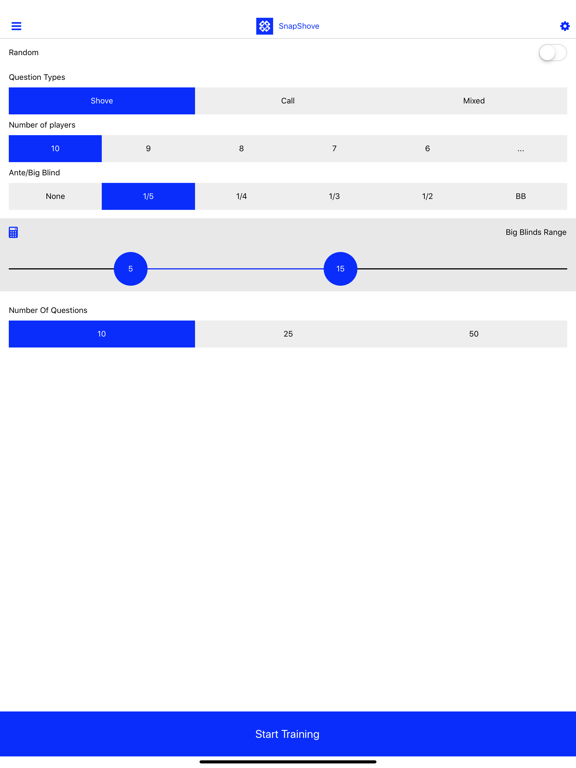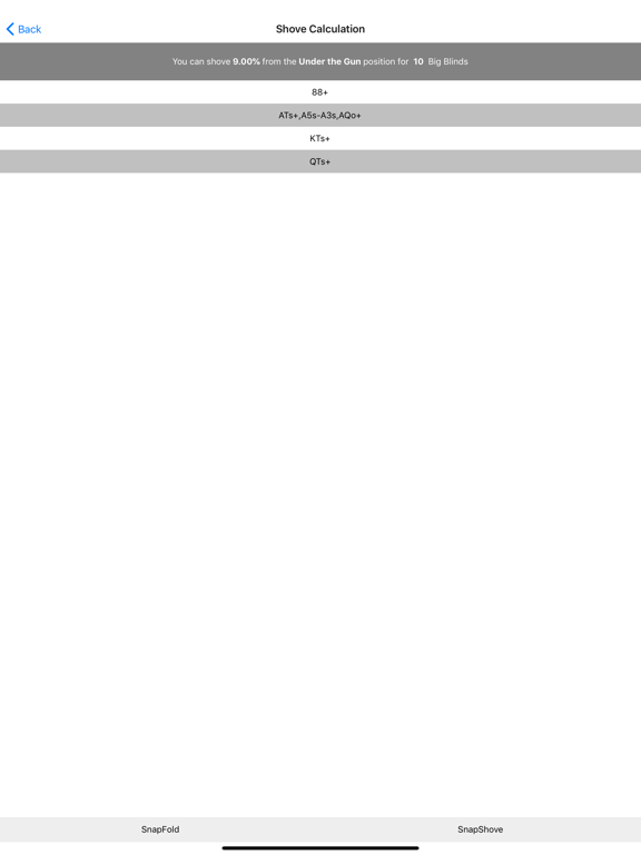 • SnapShove Pro offers even more precise calculations with a wider range of options for player numbers, antes and big blind increments