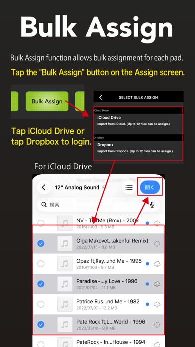 Sound sources can be downloaded and assigned from the Music library, iCloudDrive, or Dropbox. Downloading requires high-speed network communication, so a Wi-Fi environment is recommended. If you use a mobile connection, please make sure to subscribe to a flat-rate plan before using the service, as communication fees may be high.