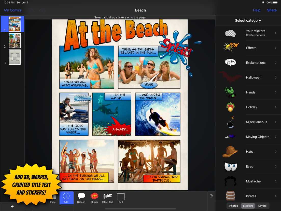 Add stickers like "Boom", "Splash", or "Bang" to spice up the action -- Even create your own library using photos from your photo-album and the built-in masking and drawing tools.
