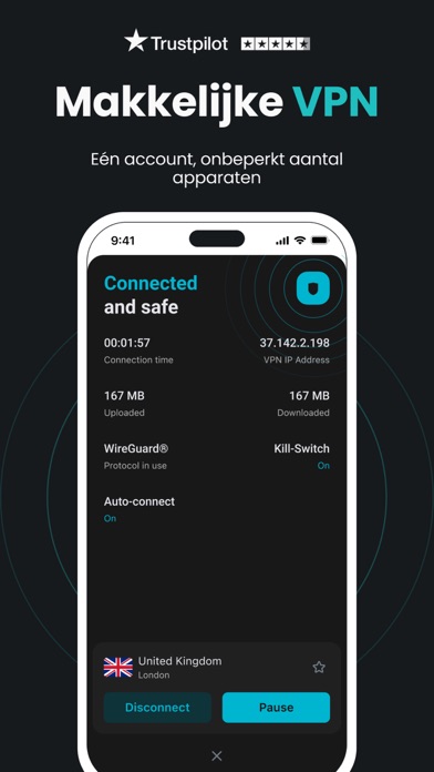 Zo makkelijk is het om onze app te gebruiken. Je logt in, selecteert een server in een land naar keuze en maakt in een paar tellen verbinding. Of je gebruikt de functie voor automatisch verbinden gebruiken om moeiteloos verbinding te maken met een VPN!
