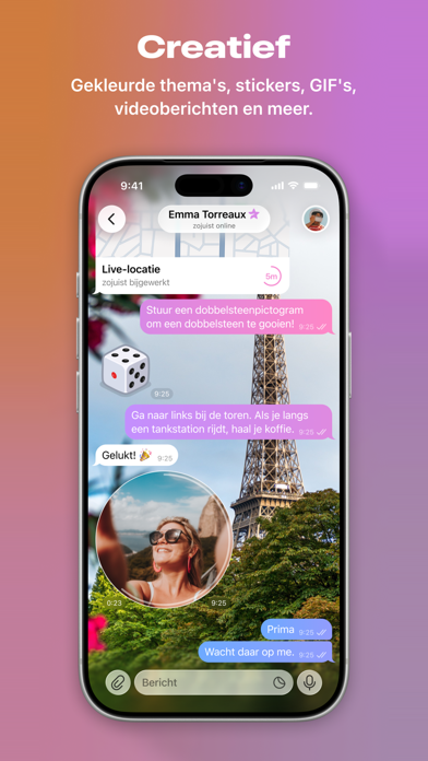 Leuk: Telegram heeft krachtige tools voor het bewerken van afbeeldingen en video's, geanimeerde stickers en emoji, volledig aanpasbare thema's om het uiterlijk van je app te veranderen en een open platform voor stickers/GIF's om je creatieve kant tegemoet te komen.