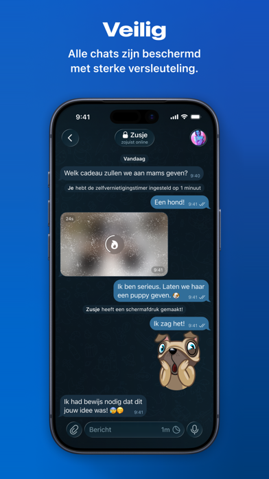 Voor gebruikers die nog meer privacy willen, biedt Telegram ook Geheime chats aan. Je kunt instellen dat berichten in Geheime chats automatisch van beide apparaten worden verwijderd. Op die manier kun je verschillende typen berichten sturen die automatisch verdwijnen — denk aan tekstberichten, foto's, video's en zelfs bestanden. Geheime chats gebruiken end-to-end versleuteling, zodat je zeker weet dat elk bericht alleen door de bedoelde ontvanger wordt gelezen.