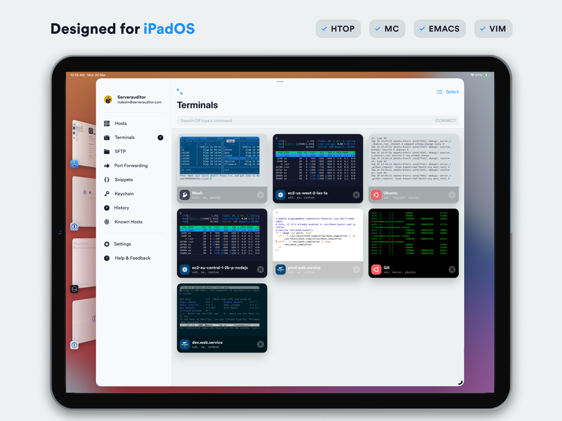 · Get a desktop-grade terminal experience with a virtual keyboard covering all the special keys required, or connect your Bluetooth keyboard.