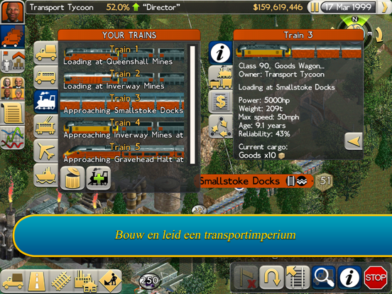 Transport Tycoon bevat alles dat het originele pc-spel tot zo'n klassieker heeft gemaakt plus tal van brilante nieuwe onderdelen - grotere, uitgebreide werelden, betere simulatie en een enorm scala aan land-, zee- en luchtvoertuigen. De intuïtieve nieuwe touchscreeninterface maakt het makkelijker dan ooit om je transportnetwerk op te bouwen en te onderhouden.