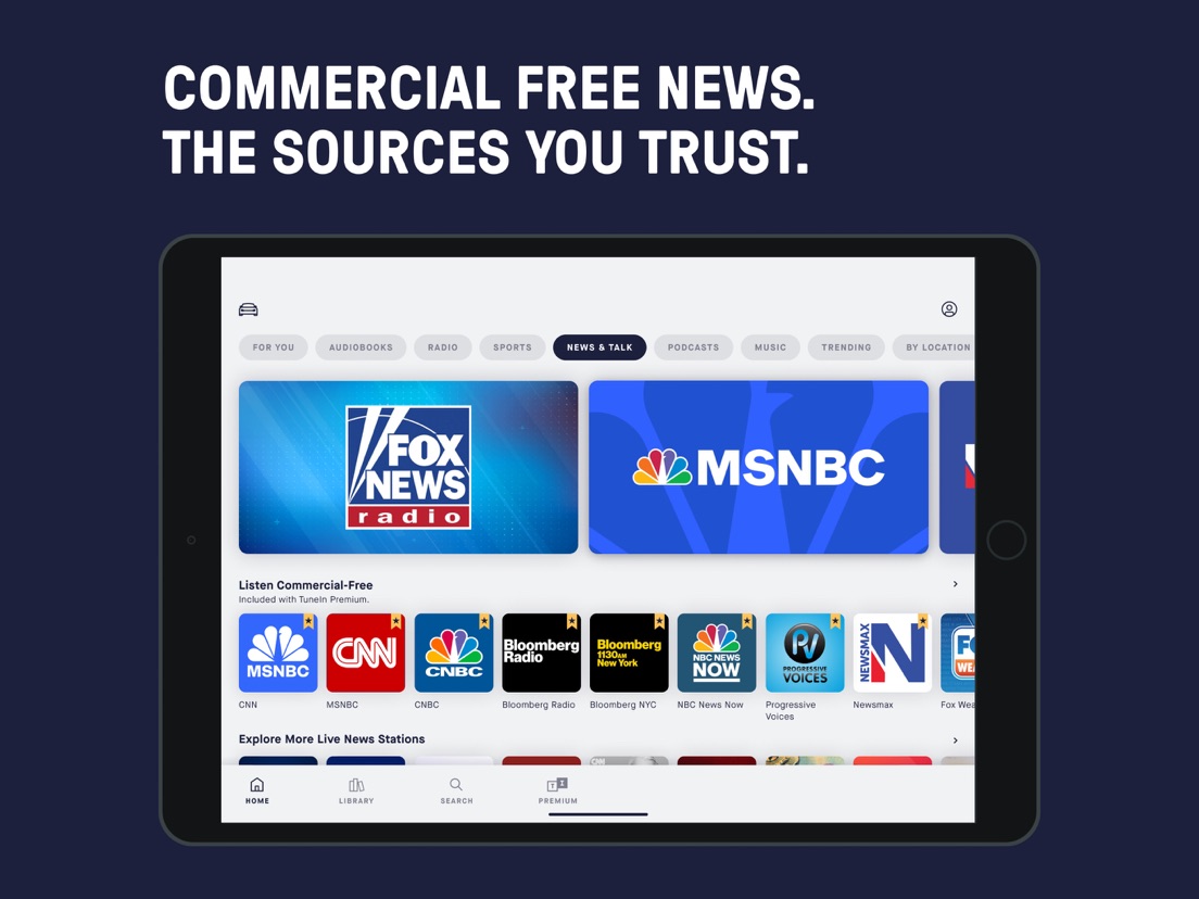 Abonnees van TuneIn Premium kunnen naar het reclamevrij nieuws van Fox News Radio en een groot aantal non-stop reclamevrije muziekzenders luisteren.