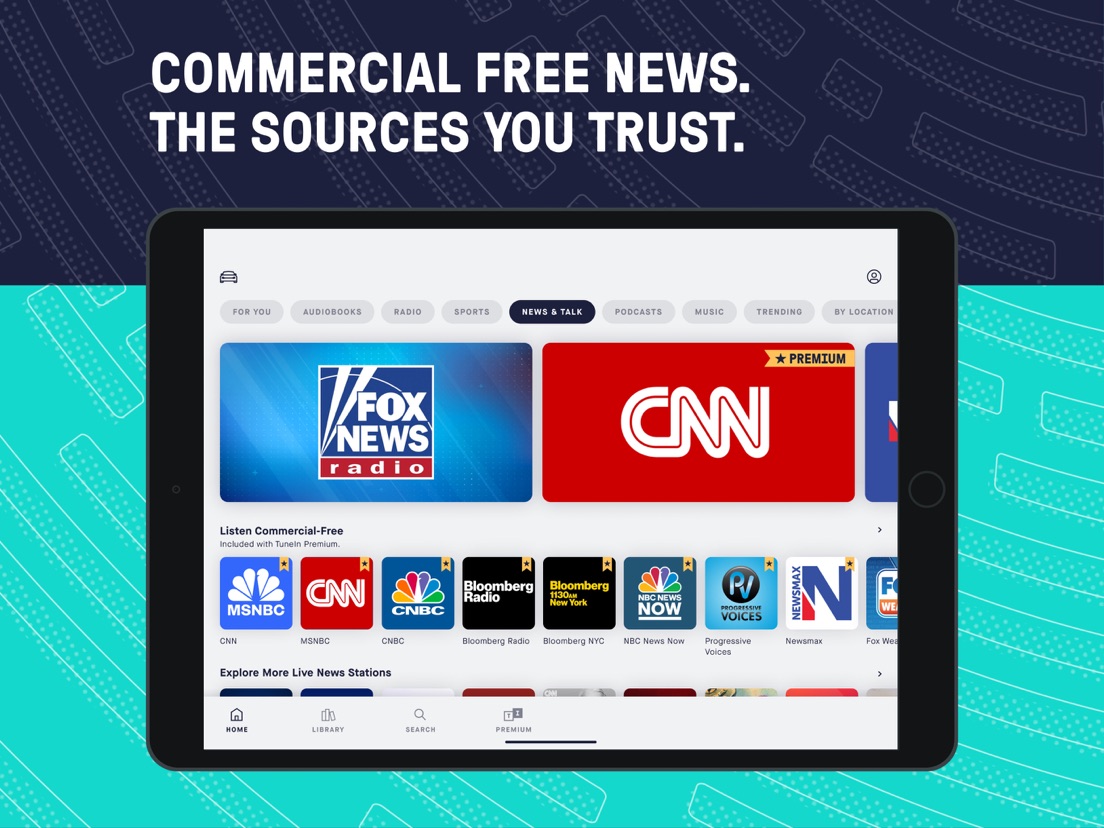 Abonnees van TuneIn Premium kunnen naar het reclamevrij nieuws van Fox News Radio en een groot aantal non-stop reclamevrije muziekzenders luisteren.
