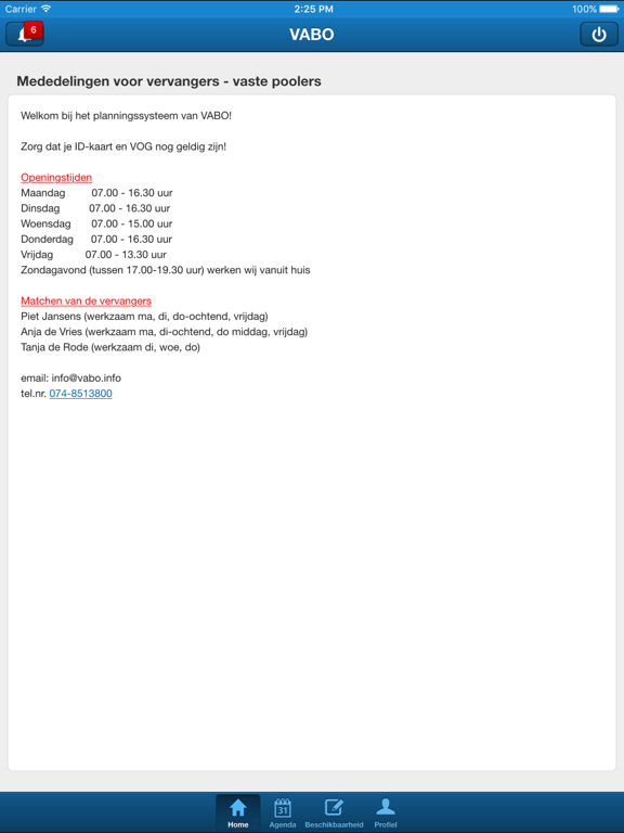 Met de VABO app is het voor u als vervanger mogelijk om uw account te beheren met uw mobiel! Nadat u bent ingelogd met dezelfde inloggegevens als in het webportaal kunt u gebruik maken van de volgende functionaliteit: