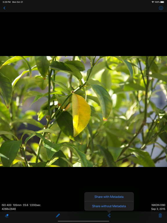 * Share photo w/o metadata on Twitter, Facebook, email.