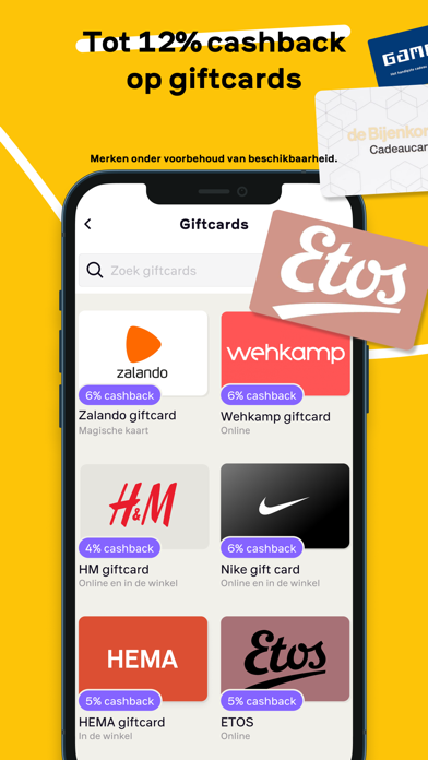 Koop in de app digitale vouchers van bekende merken en ontvang direct cashback. Je kiest zelf het bedrag (geen restbedrag). Vouchers kun je online en in de winkel gebruiken, vaak bovenop de winkelkorting.