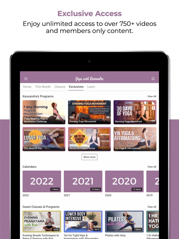 Enjoy the collection of classes from the Yoga with Kassandra YouTube library as well as some exclusive members-only classes, monthly calendars and programs. New exclusive classes, programs and monthly calendars are added every month. You can't find those anywhere else!