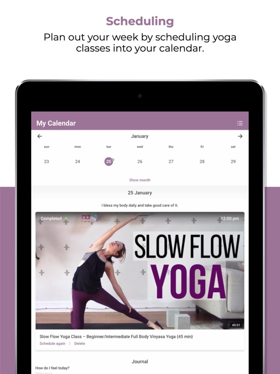 The in-app calendar allows you to schedule your yoga classes ahead of time and stay accountable throughout the week! When you do a yoga class it will automatically log it in your calendar so you can track your progress and reach your goals.