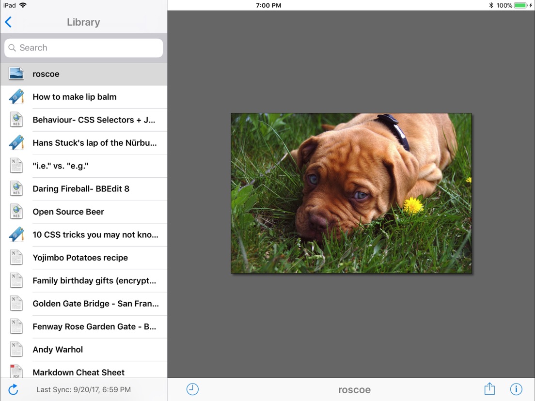 Yojimbo for iPad is a companion app that syncs effortlessly over WiFi from Yojimbo for macOS (version 4.0 or later required; sold separately), letting you take all of your Yojimbo data anywhere. Yojimbo for iPad even handles your encrypted entries.